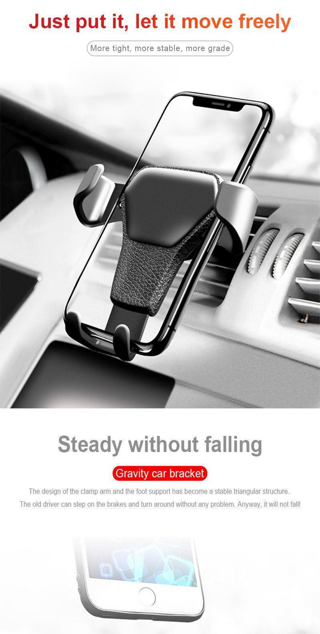 With gravity linkage design, you just need to put in or take out your phone with one hand, which will clamp it or release it automatically. - Perfectly fit for all smart phones